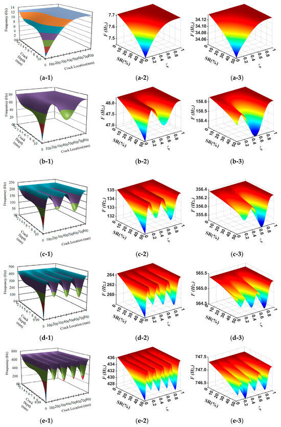 The relationship among natural frequencies, stiffness reduction, and damage locations. The first, second, and third columns represent the analytical technique for the beam [17], simulation for the beam, and simulation for the blade, respectively. (a-1–a-3) mode 1, (b-1–b-3) mode 2, (c-1–c-3) mode 3, (d-1–d-3) mode 4, and (e-1–e-3) mode 5.