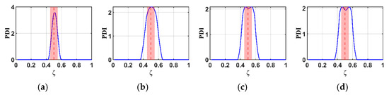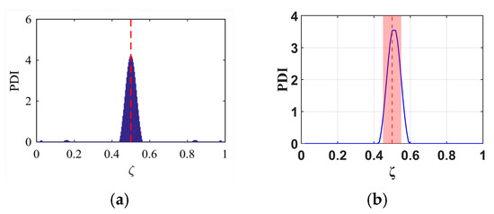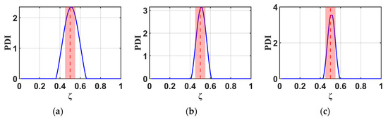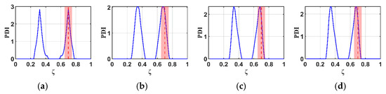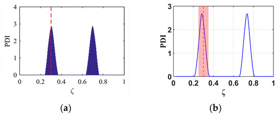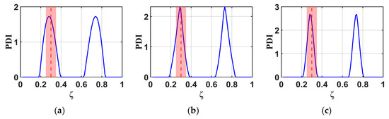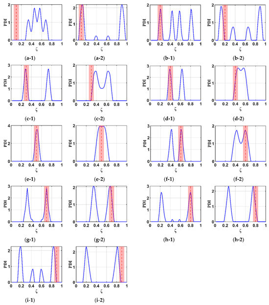 According to the theory of the B-RNFC method, the damage-detecting outcomes exhibit symmetric peaks, corresponding to the actual damage location and its false counterpart. This is a common phenomenon from the probability improvement in Equation (13). Even though the results show symmetric peaks, they narrow down to two possible damage locations. The B-RNFC results in Figure 5, corresponding to a normalized damage location () of 0.5, show a single PDI peak at the mid-span for both structures. This is because the actual damage is located at its own mirror point of structural symmetry. Conversely, for damage at , the results show the symmetric PDI peaks, as shown in Figure 6. Lastly, the simulation results from both beam and blade structures are validated against a previous study [18] that analyzed the B-RNFC method on a fixed-fixed beam. It is shown that the PDI peak locations accurately identify damage at both mid-span and non-mid-span positions. The trends observed in this study align with those reported in prior research.