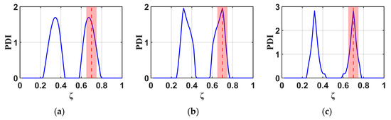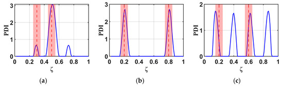 Figure 13c illustrates Case 3, where multiple damages are located at ζ = 0.2 and 0.6, representing a non-symmetric damage configuration along the cantilever beam. The results indicate that the damage at ζ = 0.6 is successfully identified, with its corresponding peak appearing within the acceptable range (red region). In contrast, the peak associated with the damage at ζ = 0.2 lies outside this acceptable range