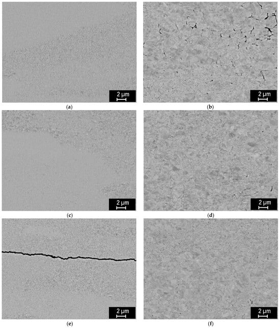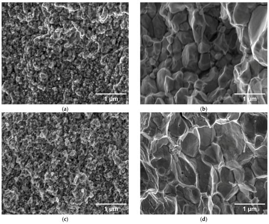 The fracture surfaces of the corresponding samples are shown in Figure 5. For the 1000, 1400, and 1800 °C sintering temperatures, mostly ultrafine grains are observed, roughly comparable to the initial powders, which indicates a limited degree of sintering. It is only at the highest sintering temperature of 2000 °C that a noticeable grain growth can be seen, in agreement with the observations on the polished sections. On the compacts sintered from the larger powder, deformed grains are again observed at 1000–1800 °C, while the shape changes to equiaxial at 2000 °C, in agreement with the cross-sectional observations.