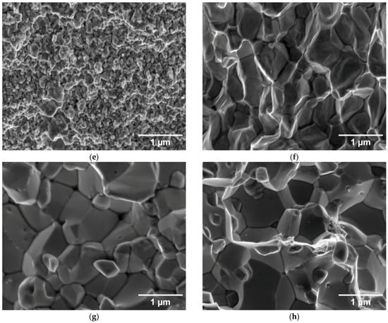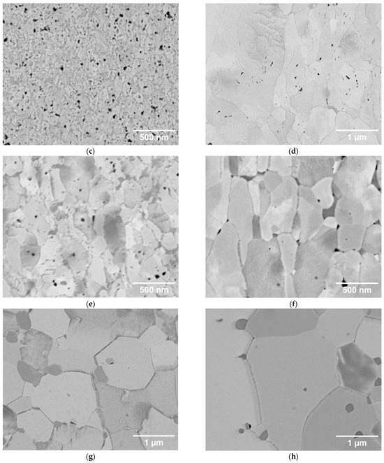 For a better visualization of the grain structure, the etched samples are shown in Figure 3. For the compacts made from the 0.4 µm powder, ultrafine grains are barely discernible for the 1000 and 1400 °C sintering temperatures. It is only at 1800 °C that submicron grains comparable to the starting powder size are revealed, and notably larger grains (above 0.4 µm) can be seen at 2000 °C. For the compacts made from the 2 µm powder, grain boundaries are well visible for all sintering temperatures. For the 1000–1800 °C temperatures, the grains are in the µm range or slightly below. They clearly show a deformed shape, demonstrating plastic deformation due to the high pressure already from the lowest temperatures. At a 2000 °C sintering temperature, significantly larger grains are observed (several µm). They also exhibit an equiaxial shape, indicating that the sintering-induced grain growth has superseded the initially deformed boundaries from the high pressure. A similar equiaxial morphology is seen for the 0.4 µm powder sintered at the highest temperature. Elemental analysis by energy-dispersive spectroscopy (EDS) has shown higher oxygen concentration at the grain boundaries; at the highest temperatures, it apparently precipitated in the form of nanometric oxide particles (small dark particles at the grain boundary junctions visible in Figure 3g,h).
