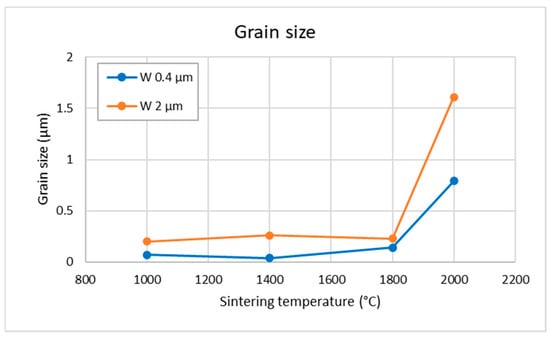 Figure 8 shows the thermal conductivity as a function of sintering temperature. The values are generally lower than those of fully dense W, and only increase significantly at the highest sintering temperature of 2000 °C, similarly to the other characteristics mentioned above. In agreement with the lower porosity, the 2 µm compacts show higher values than those from the 0.4 µm powder and approach those reported for fully dense W (160–170 W/m·K) [15,16] at the maximum sintering temperature. The reduced value for 0.4 µm and 1800 °C is likely caused by the cracks (cf. Figure 2e). The measurements at higher temperatures showed roughly similar values as at room temperature and principally the same trends with respect to individual samples.