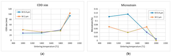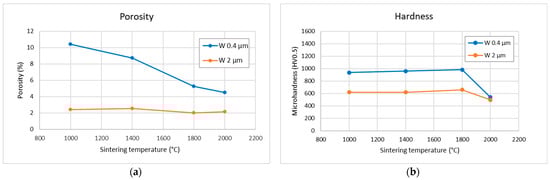 Figure 7a shows the evolution of porosity (determined from density measured by the Archimedean method, assuming pure W skeleton) as a function of sintering temperature for the two powders. Expectedly, the porosity of compacts sintered from the 0.4 µm powder decreases with sintering temperature. Somewhat surprisingly, the porosity of compacts made from the 2 µm powder is lower and does not show a strong variation with temperature. The higher porosity of the 0.4 µm compacts may be caused by the finer powder’s higher tendency to agglomeration, and thus less homogeneous settling of the powder in the die, which may lead to regions of higher porosity. The negligible changes in porosity in the 2 µm powder compacts agree well with the SEM observations in Figure 3. Microhardness measurements were also performed to obtain an additional qualitative measure of the degree of sintering. The results are shown in Figure 7b. The plots show nearly no trend with respect to the sintering temperature, except for a change at 2000 °C. The trends suggest a correlation with grain size, as predicted by the Hall-Petch relationship [13,14]. For one, the hardness is higher overall for compacts made from the finer powder, despite their generally lower degree of sintering. Furthermore, the hardness is slightly reduced for both powders at the highest sintering temperature, where the grains have grown to a discernible size.
