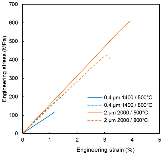 Tensile properties are illustrated in Figure 9. The tests were started at 800 and 500 °C, where ductile behavior could be most likely expected. For all samples, the stress increased linearly up to the point of fracture, reaching strains in units of %. Fracture surfaces (Figure 4) show dominantly intergranular fracture, i.e., along grain boundaries, without any marked signs of ductile behavior. This is clearly visible on the 2 µm powder compacts, but less discernible on the 0.4 µm compacts. Minor oxygen impurities, as detected by EDS, may have contributed to the weakening of the grain boundaries [17,18]. It might be noted that carbon diffusing into the samples from the graphite die presents a reducing environment [19,20]. Since all four tested samples exhibited brittleness, even at these elevated temperatures, it was decided not to test all variants at all temperatures.