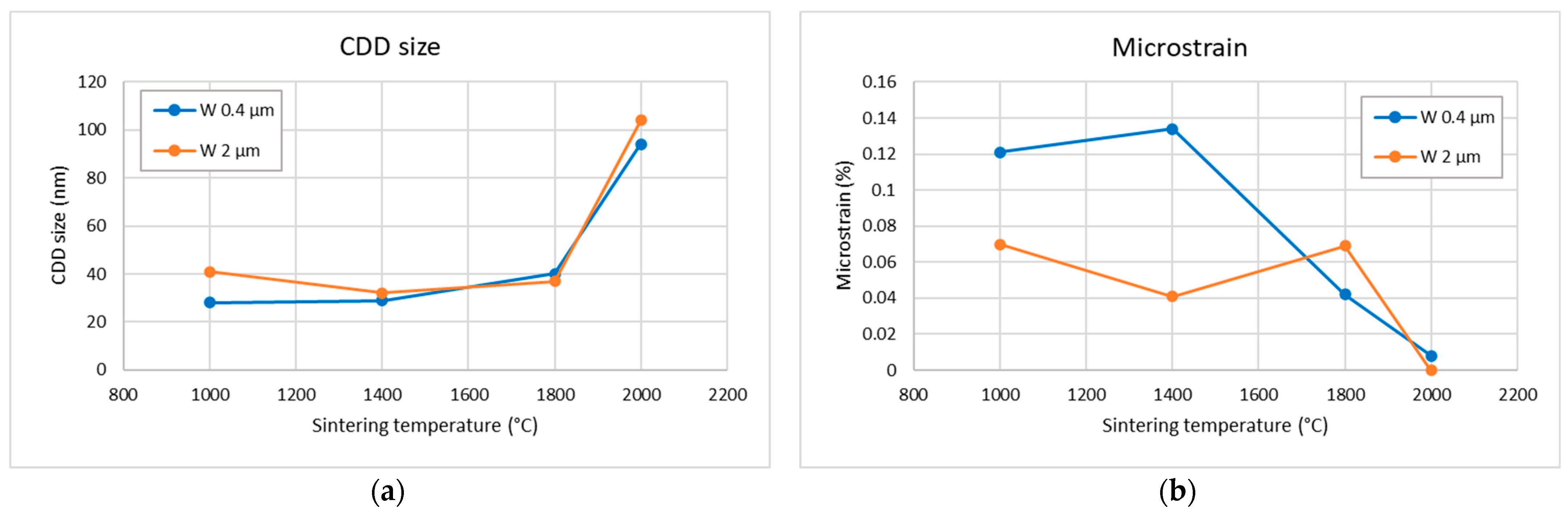 Figure 6 shows the size of the coherently diffracting domains as a function of the sintering temperature. For the lower temperatures, it remains roughly constant but increases significantly only at the 2000 °C sintering temperature. Similarly, the microstrain also decreases significantly at the highest sintering temperature. XRD did not detect any carbides or oxides. The XRD patterns are provided in the
