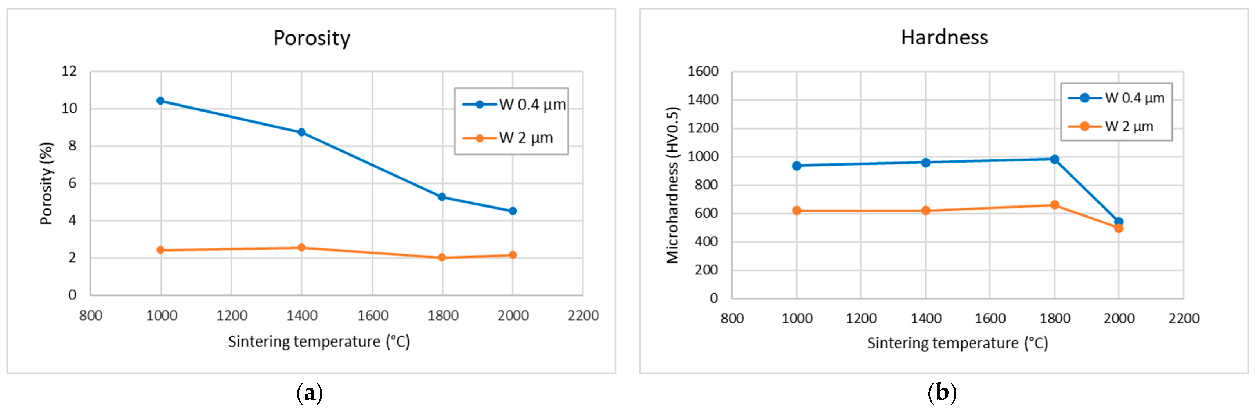 Figure 7a shows the evolution of porosity (determined from density measured by the Archimedean method, assuming pure W skeleton) as a function of sintering temperature for the two powders. Expectedly, the porosity of compacts sintered from the 0.4 µm powder decreases with sintering temperature. Somewhat surprisingly, the porosity of compacts made from the 2 µm powder is lower and does not show a strong variation with temperature. The higher porosity of the 0.4 µm compacts may be caused by the finer powder’s higher tendency to agglomeration, and thus less homogeneous settling of the powder in the die, which may lead to regions of higher porosity. The negligible changes in porosity in the 2 µm powder compacts agree well with the SEM observations in