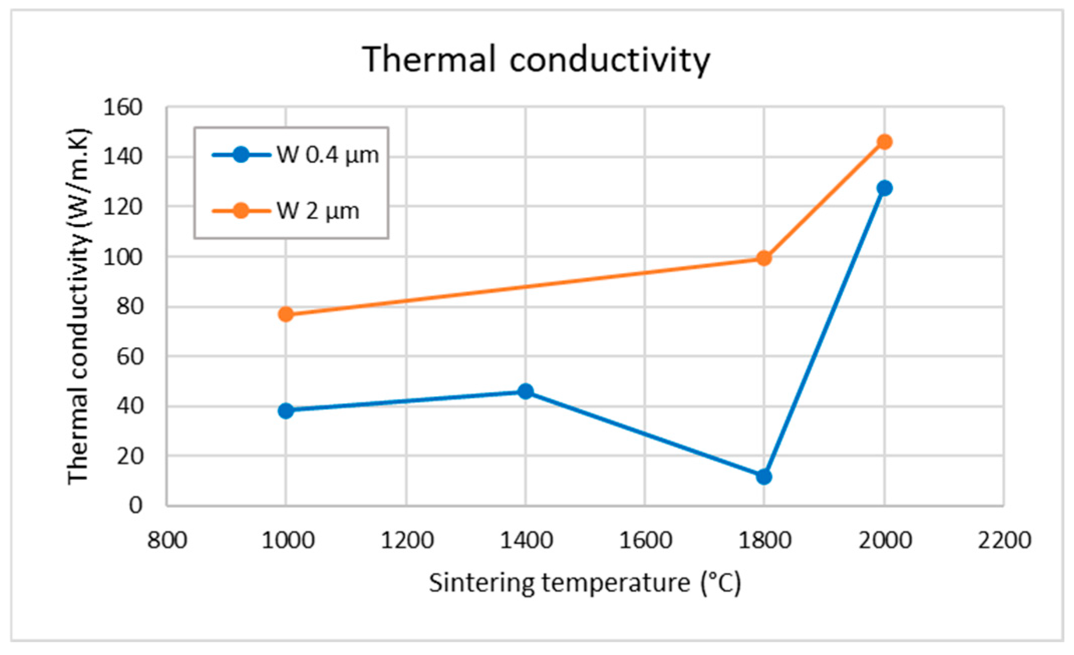 Figure 8 shows the thermal conductivity as a function of sintering temperature. The values are generally lower than those of fully dense W, and only increase significantly at the highest sintering temperature of 2000 °C, similarly to the other characteristics mentioned above. In agreement with the lower porosity, the 2 µm compacts show higher values than those from the 0.4 µm powder and approach those reported for fully dense W (160–170 W/m·K) [