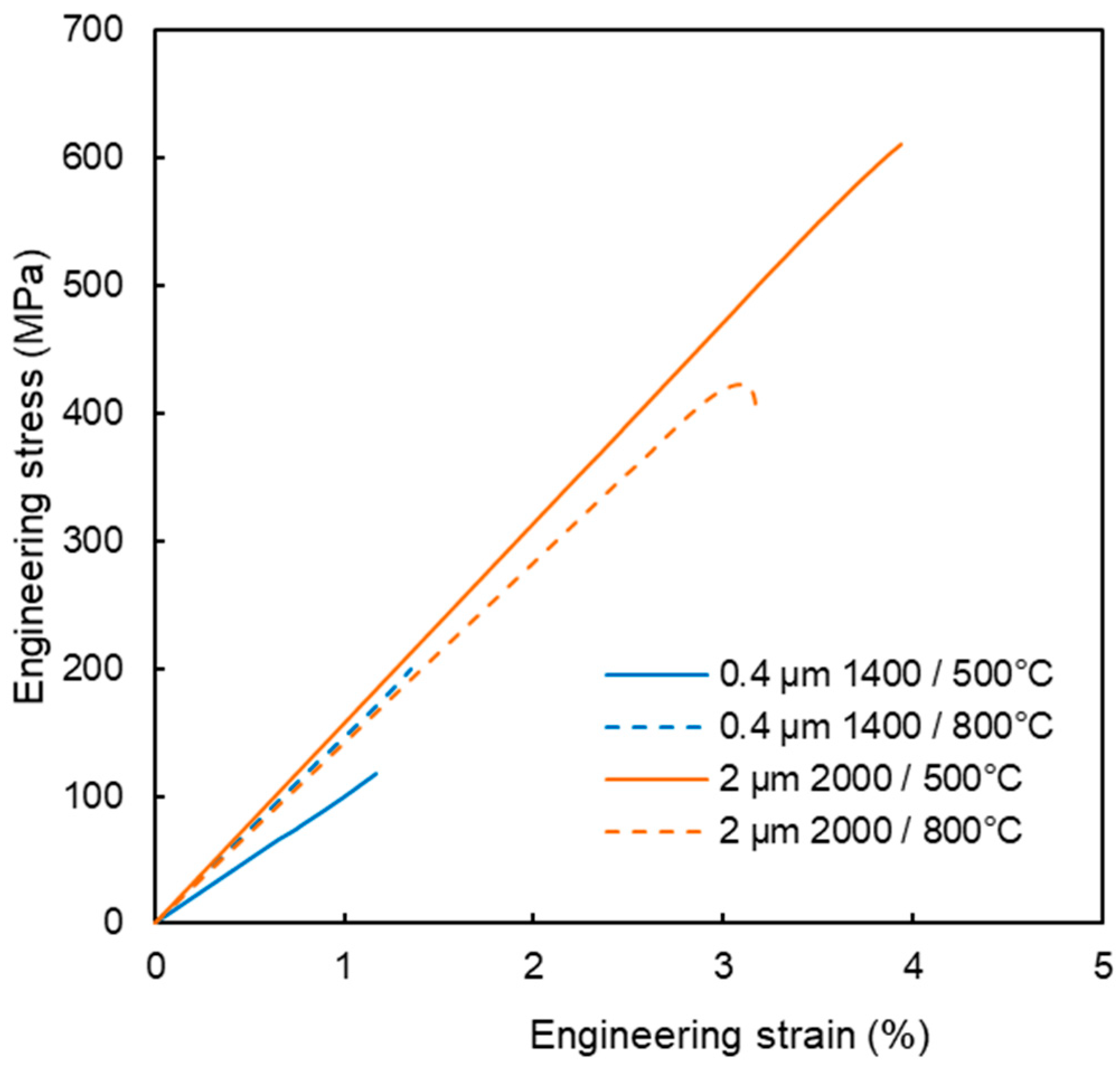 Figure 9. The tests were started at 800 and 500 °C, where ductile behavior could be most likely expected. For all samples, the stress increased linearly up to the point of fracture, reaching strains in units of %. Fracture surfaces (