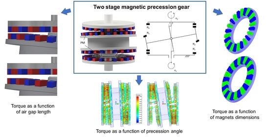- Macyszyn, L.; Jedryczka, C.; Mysinski, M. Analysis of a Two-Stage Magnetic Precession Gear Dynamics. Energies 2023, 16, 4484. [Google Scholar] [CrossRef]