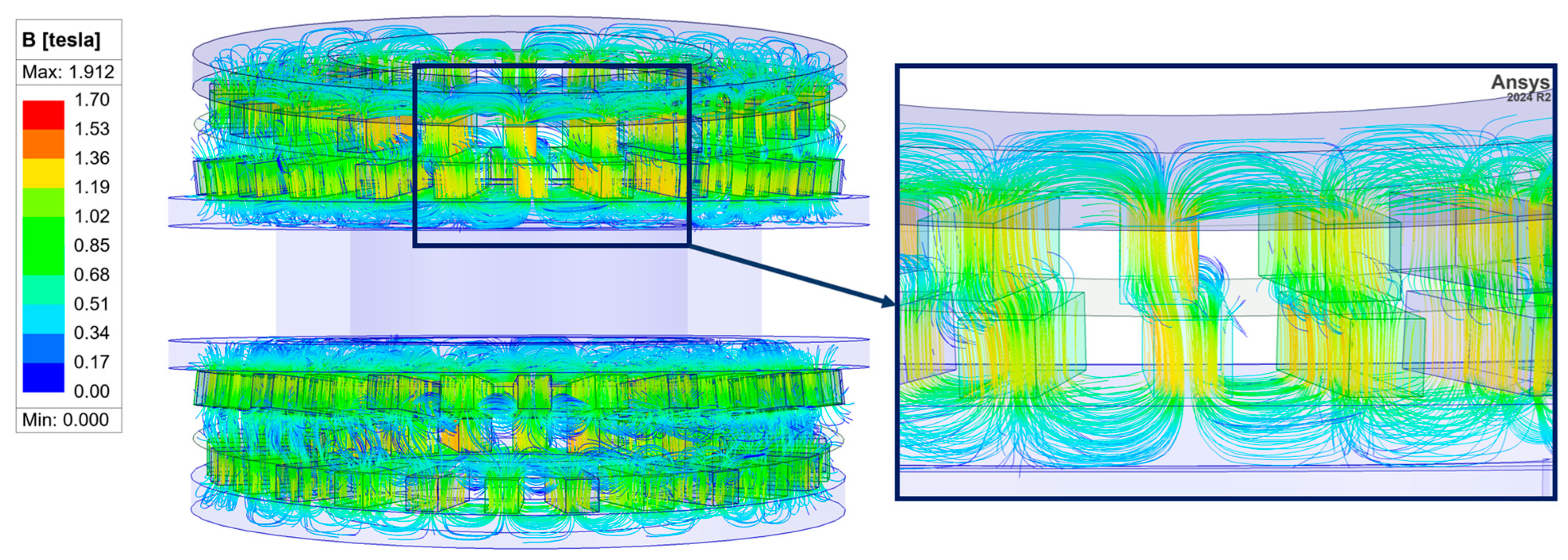 - Khan, S.A.; Afsari, P.; Gardner, M.C. Comparison between Flux Angle Mapping and Cycloidal Magnetic Gears for High Gear Ratio Applications. In Proceedings of the IEEE Energy Conversion Conference and Expo ECCE—Proc., Phoenix, AZ, USA, 20–24 October 2024; Institute of Electrical and Electronics Engineers Inc.: New York, NY, USA, 2024; pp. 5337–5342. [Google Scholar]