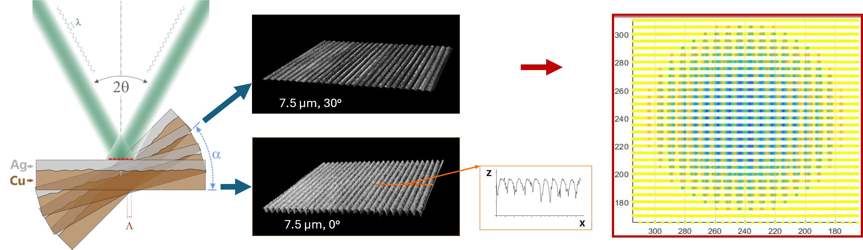 Despite these challenges, successful fabrication of 2 µm periodic structures on aged material tilted at 15° was achieved. This success is attributed to the distinct surface properties of the aged material, particularly the presence of Sn and Cu