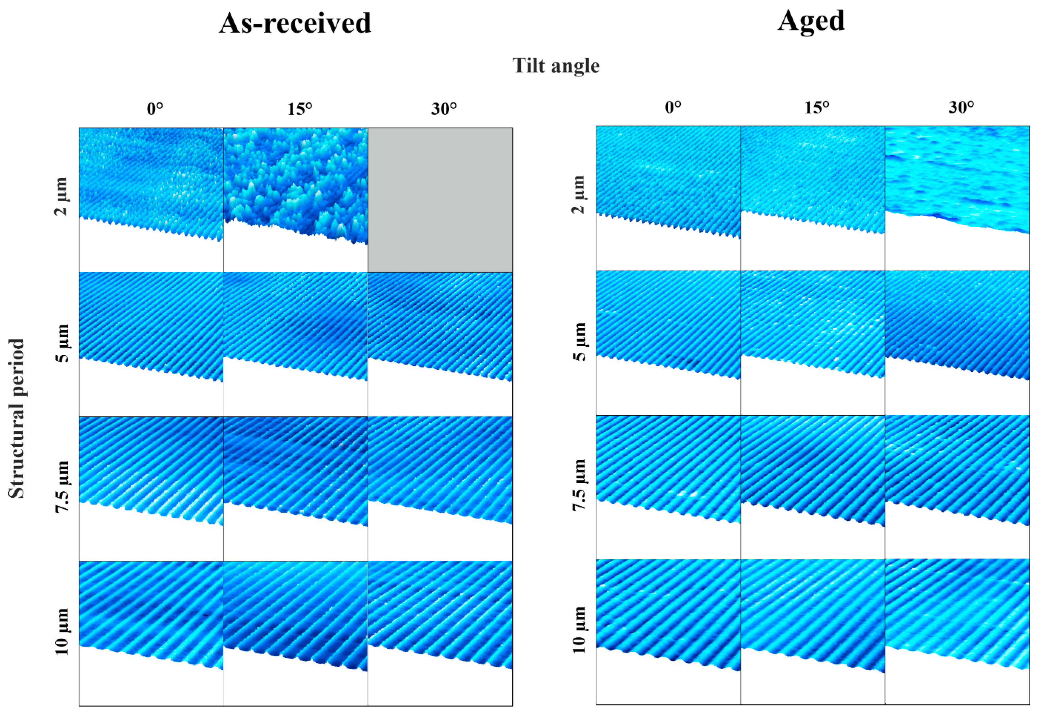 To ensure structural homogeneity, tilt angles that result in irregular or poorly defined features are not further investigated. Additionally, tilt angles exceeding those previously specified were not considered. As a result, the 2 µm periodic structure at 30° tilt on the as-received material was not fabricated. Additionally, the 2 µm/15° structure on the as-received material and the 2 µm/30° structure on the aged material are excluded from further analysis due to insufficient pattern quality.