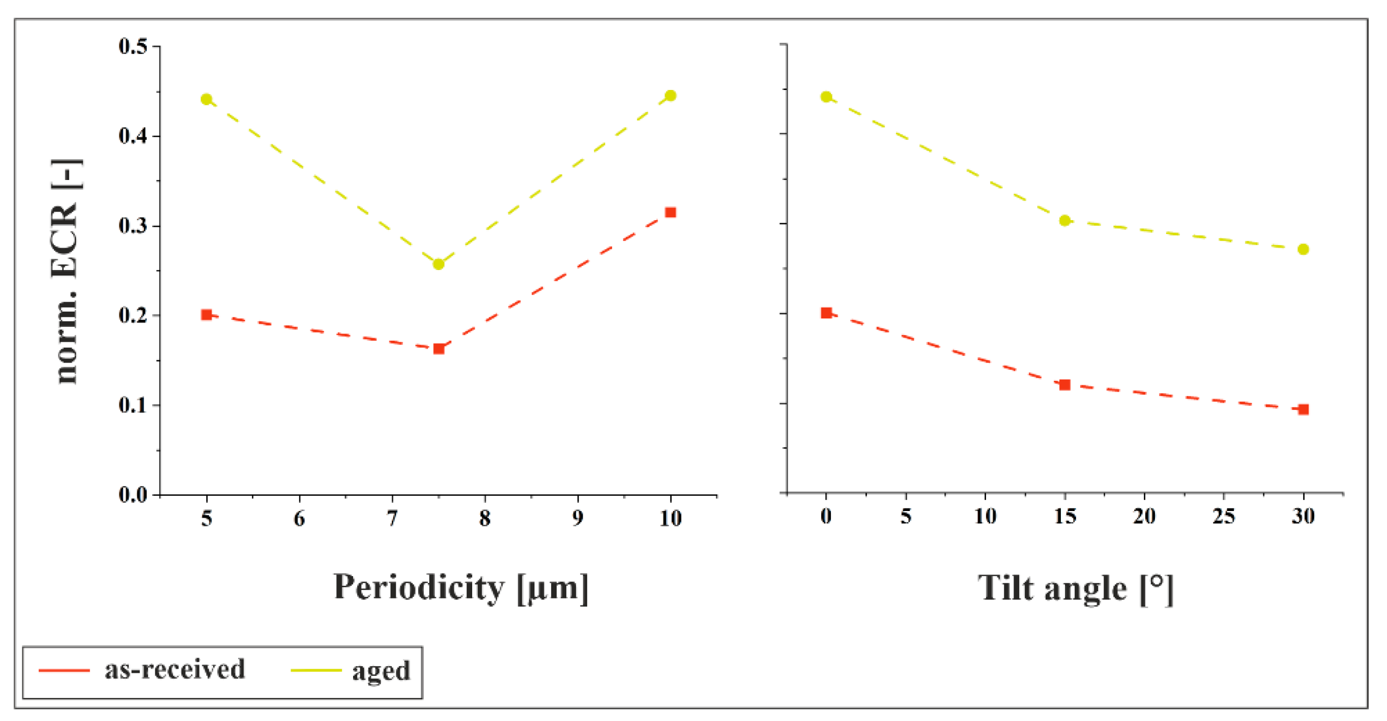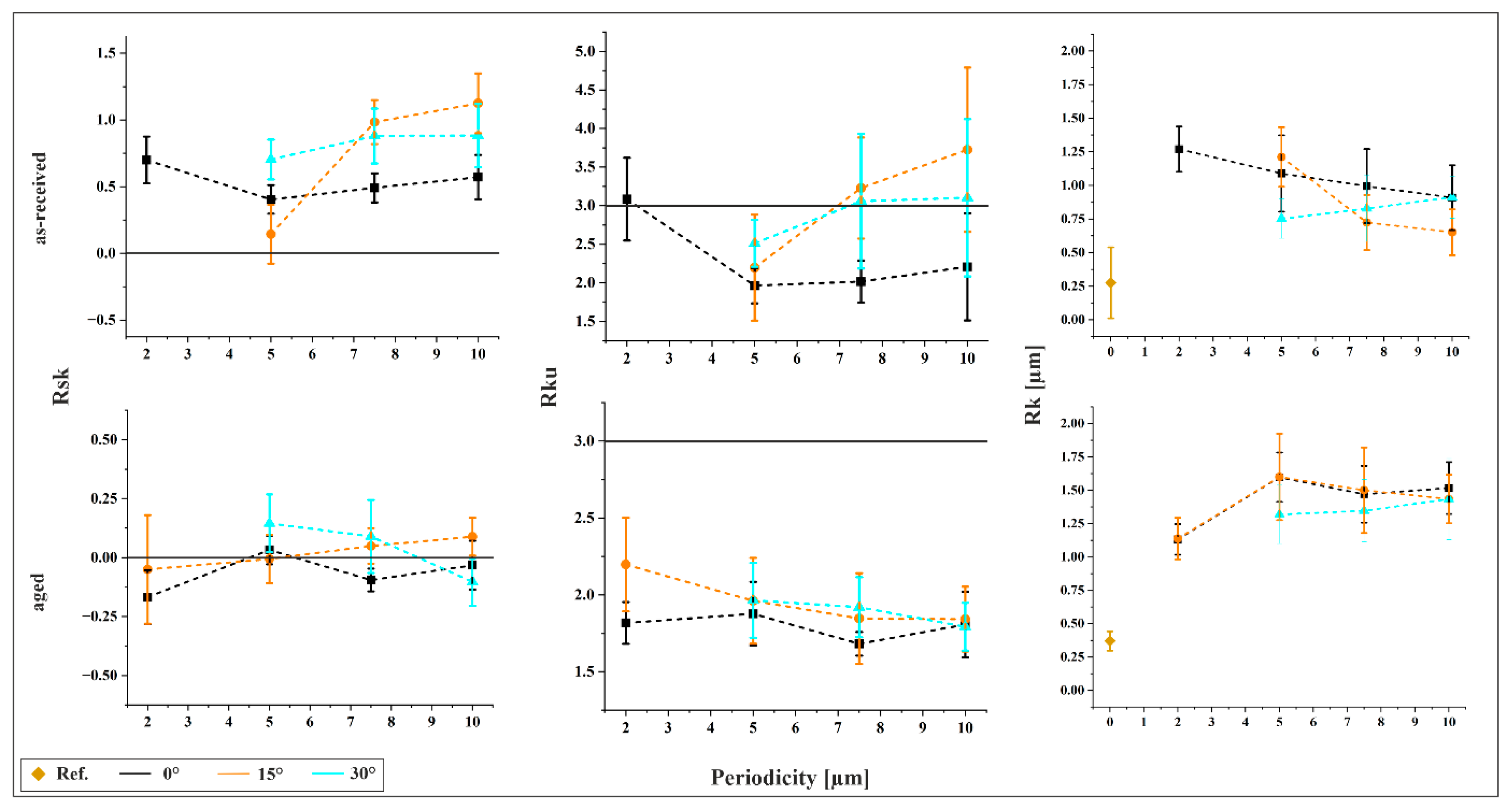 Figure 4 presents the surface parameters skewness (Rsk), kurtosis (Rku), and core roughness (Rk) for all structured samples. For comparison, Rk is also shown for the reference sample. The as-received material exhibits a positive skewness, indicating a surface dominated by peaks and a relatively low load-bearing capacity. This reduced capacity is further supported by the Rk values, which are consistently higher than that of the reference. A decreasing trend in Rk is observed with increasing inclination, suggesting improved load-bearing capacity. The lowest Rk is found for the 10 µm/15° structure. In the aged material, Rk remains higher than the reference across all structures, with the minimum value observed for 2 µm/15°. Unlike the as-received condition, Rk tends to increase with feature size, indicating a decline in load-bearing performance. Skewness values for aged samples are narrowly distributed around zero, implying a balanced topography with comparable proportions of peaks and valleys.