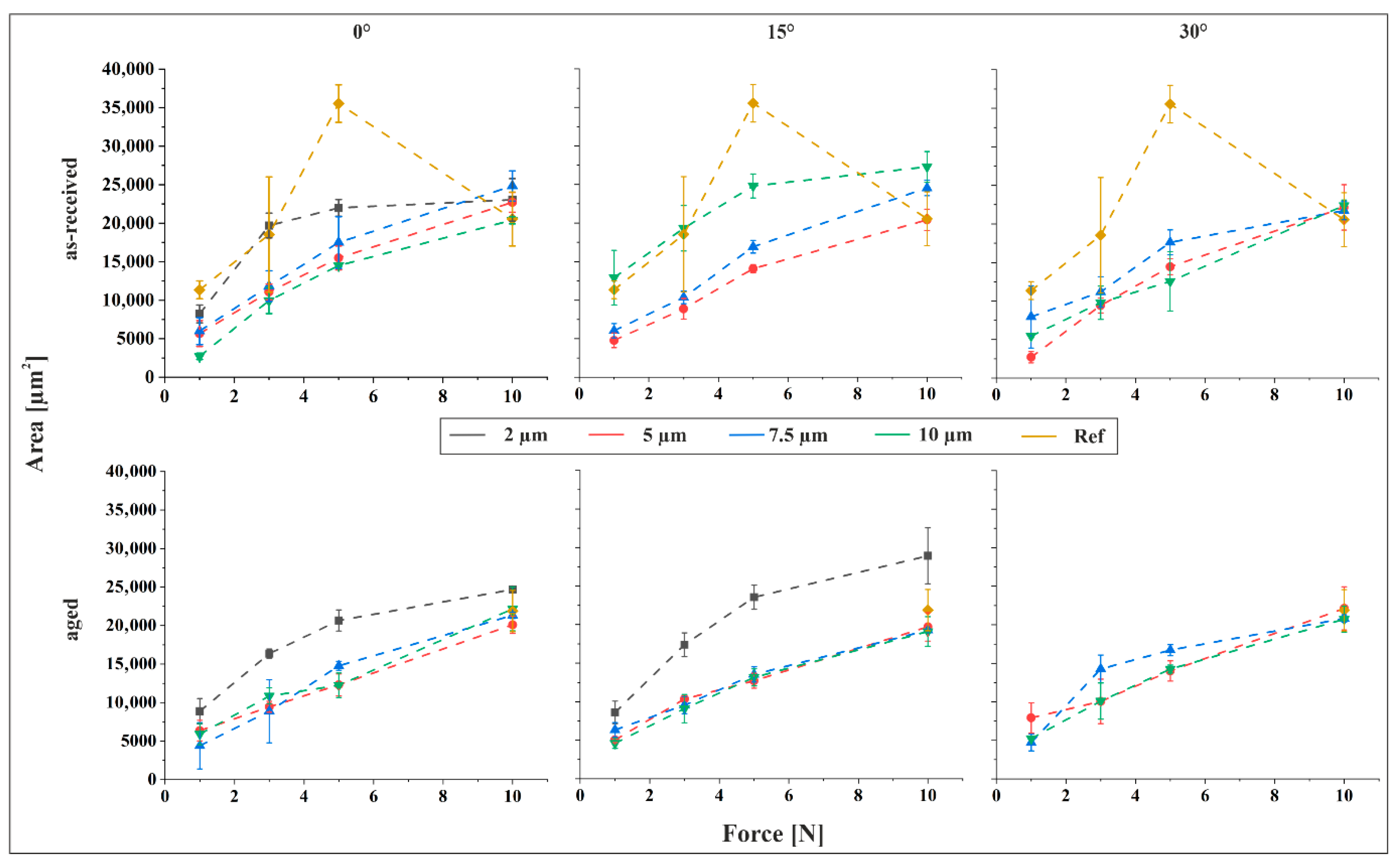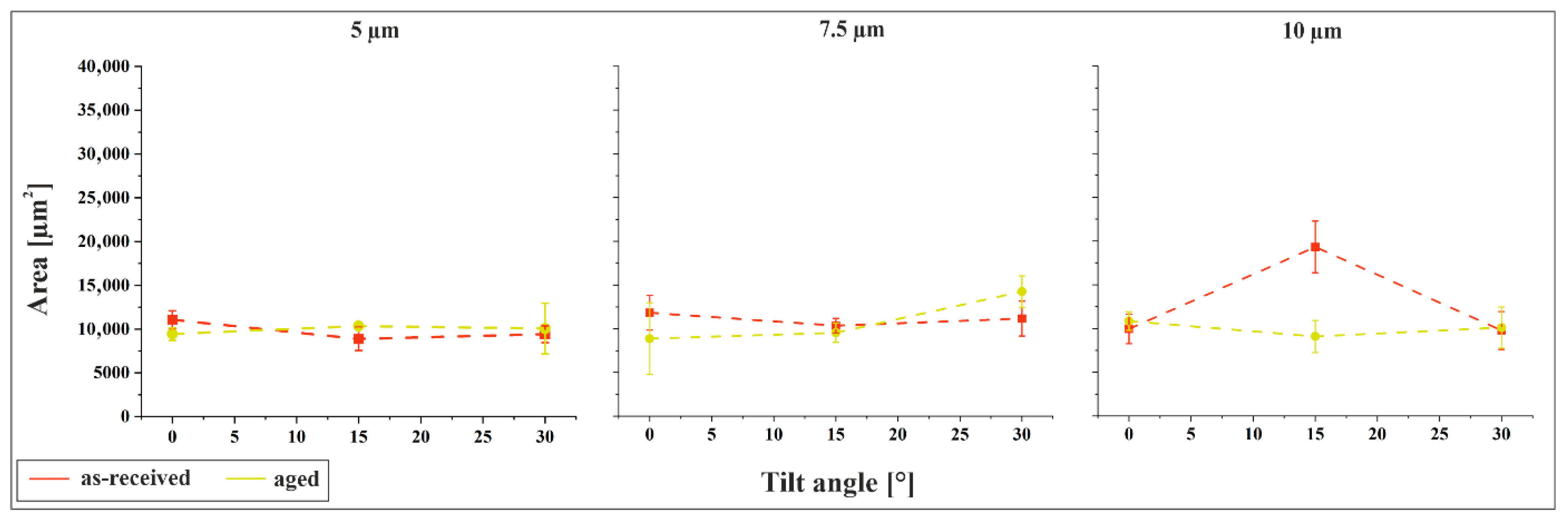 The difference in indent size between the as-received and aged materials is generally minimal. An exception is observed for the 10 µm/15° configuration, where the as-received material exhibits indent areas nearly twice as large as those of the aged material. This behavior has been previously discussed and is attributed to the surface morphology, particularly the pronounced skewness and kurtosis that characterize the as-received sample in this configuration.