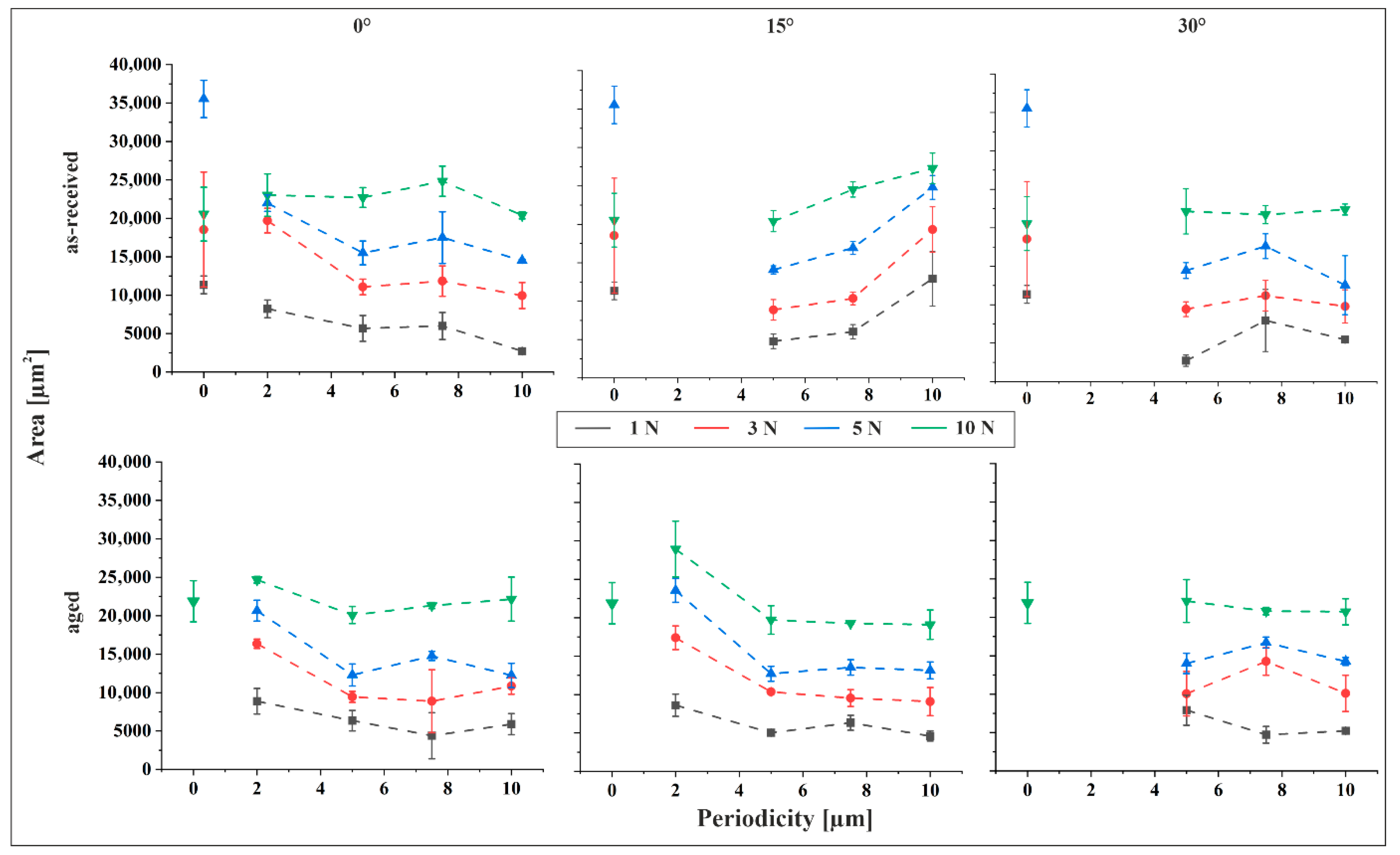 Figure 6 as a function of periodicity, with the tilt angle held constant in each plot. For the aged material reference, the contact zone was discernible in CLSM images only at a normal force of 10 N. This can be attributed to the significantly lower core roughness of the reference sample, approximately one-third that of the structured specimens, resulting in a substantially higher load-bearing capacity. Consequently, no visible indents were observed at lower forces. In contrast, for the as-received material reference, the contact zone was evident even at lower forces. This is explained by the markedly lower hardness of Sn compared to Cu