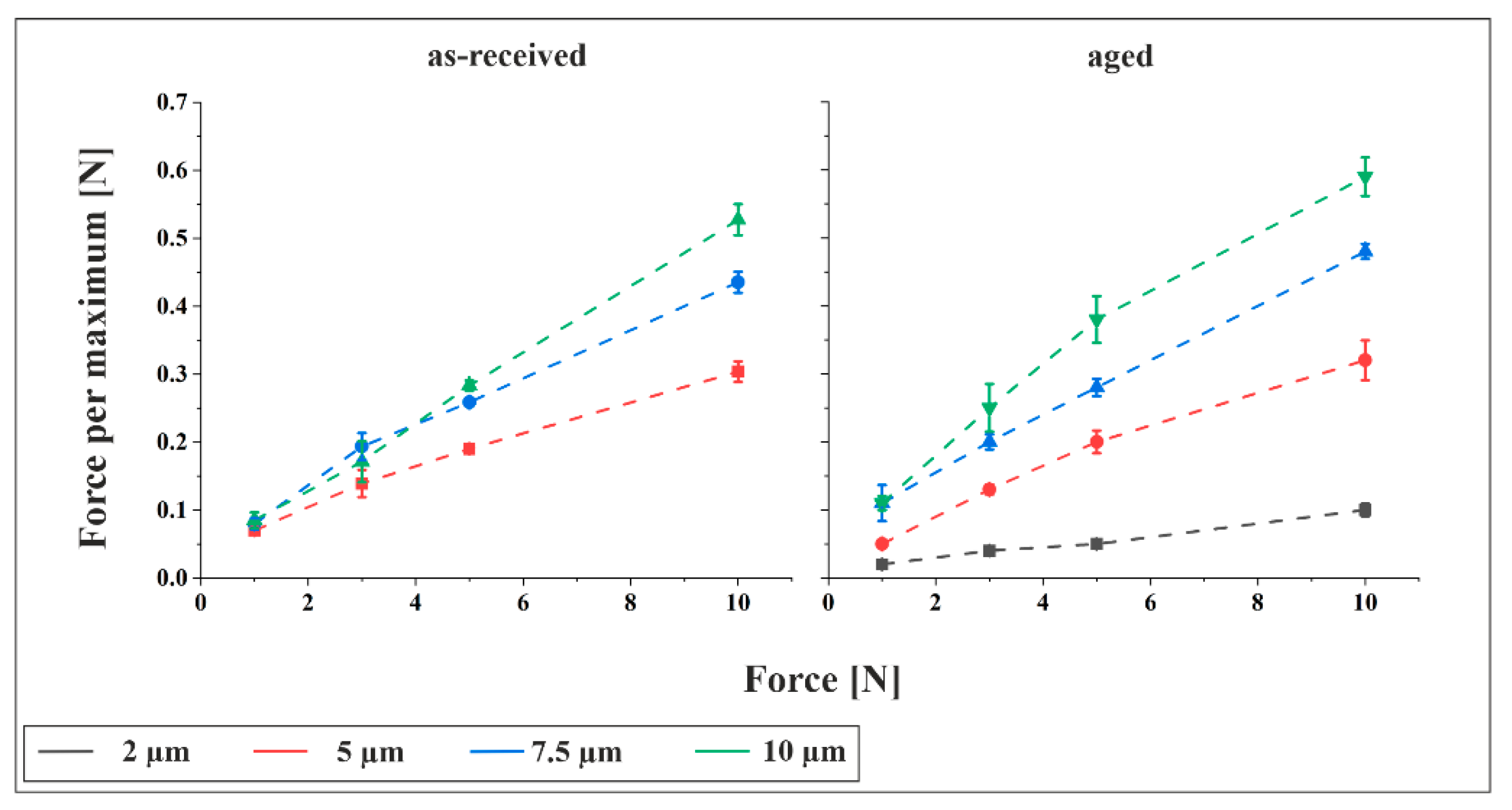 Figure 6 reveals that normal force exerts a more pronounced influence on indent size than structural periodicity. As expected, indent size increases consistently with rising force across all measurement series. An exception is observed in the reference sample of the as-received material, where the indent size at 5 N exceeds that at higher forces, including 10 N. This anomaly suggests a potential measurement error. Supporting this interpretation, the trend of increasing indent size with force resumes when the 5 N data point is excluded, and the remaining values fall within the expected range for the as-received reference. Consequently, the 5 N value is treated as an outlier.