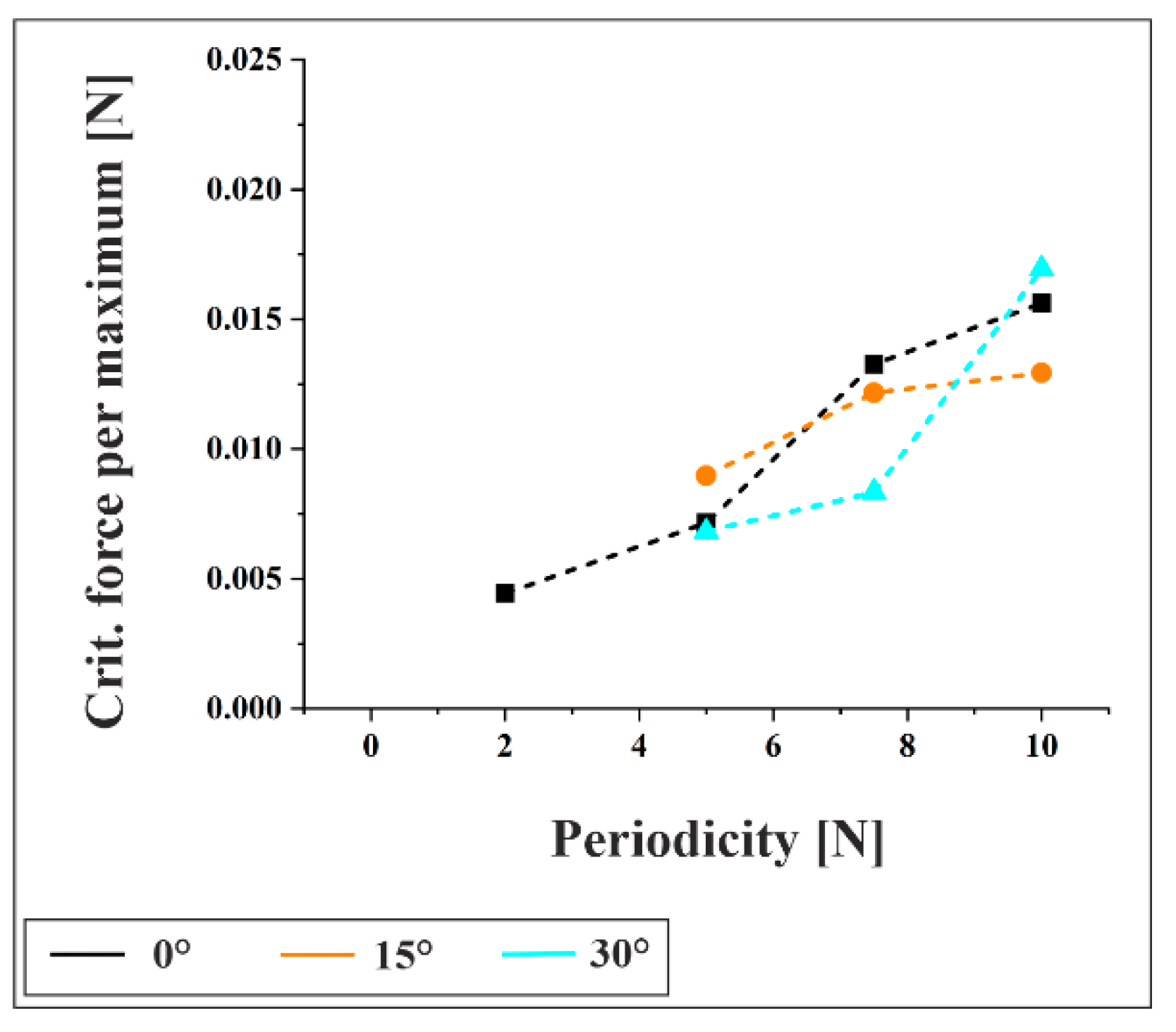 Figure 9 displays the calculated critical load per maximum for the onset of plastic deformation, based on Equation (4), for the as-received material under a 3 N contact force. The results indicate that the critical load increases with feature size, suggesting that structures with larger periodicities are mechanically more stable and require higher loads to initiate plasticity. This trend is consistent across all tilt angles. A comparison between