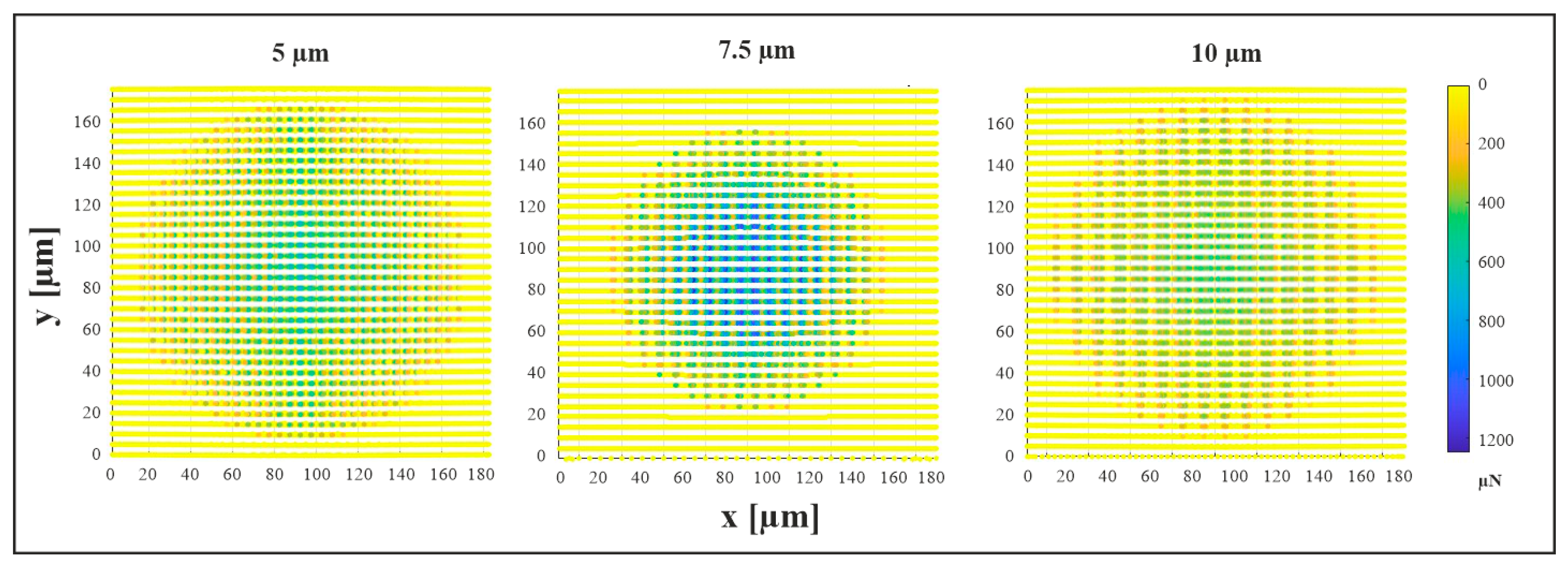 Figure 10 presents the simulated contact force distribution for the as-received material in the 10 µm/0° configuration under a normal load of 3 N, corresponding to the point of maximum measured force. The apparent contact area exhibits a circular geometry, whereas the actual contact area comprises multiple elliptical regions localized at topographical maxima. Subsequently, the real contact area was quantified based on these images, while the apparent contact diameter was determined post-unloading, following the procedure described earlier.