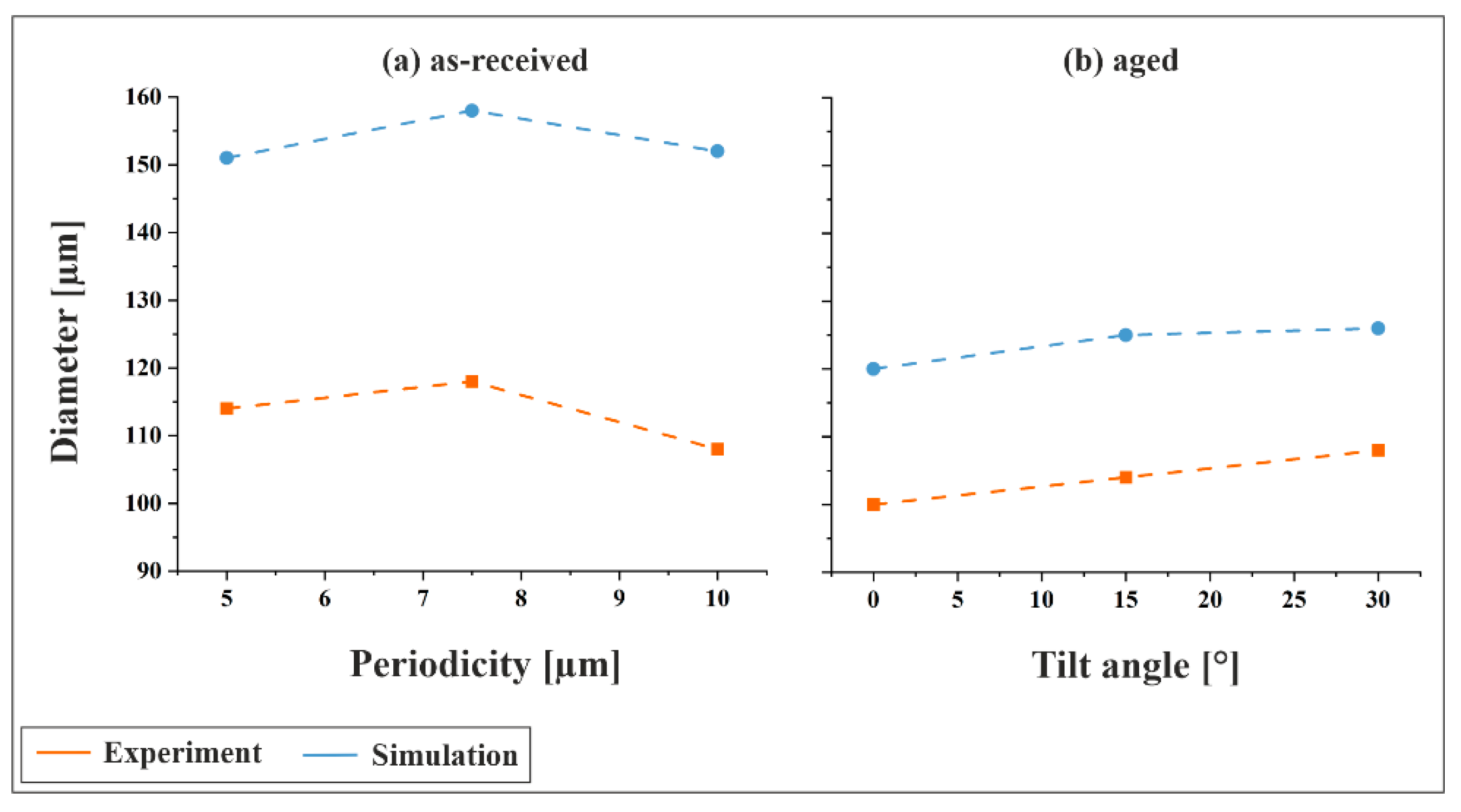 Figure 11b presents the comparison for the aged material using the second parameter set, focusing on the influence of tilt angle at a fixed periodicity of 5 µm. Both experimental and simulated results show a consistent trend of increasing indentation diameter with increasing tilt angle, indicating that inclined structuring leads to less mechanically stable surface topographies.