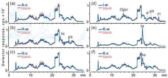 TIC chromatograms acquired by ESI-MS/MS in dMRM mode of negative ions for methanol-water-formic acid blanks and sample extracts from: (a) band A (core), (b) band H (warp/weft), (c) band H (core), (d) band I (warp/weft), (e) band K (warp/weft), and (f) band K (core); lOglcr—luteolin O-glucuronide, ka—kermesic acid, al—alizarin, g/a—genkwanin/acacetin, rt1—anthraquinone dimer; w—warp and main weft; c—fibrous core of metal thread.