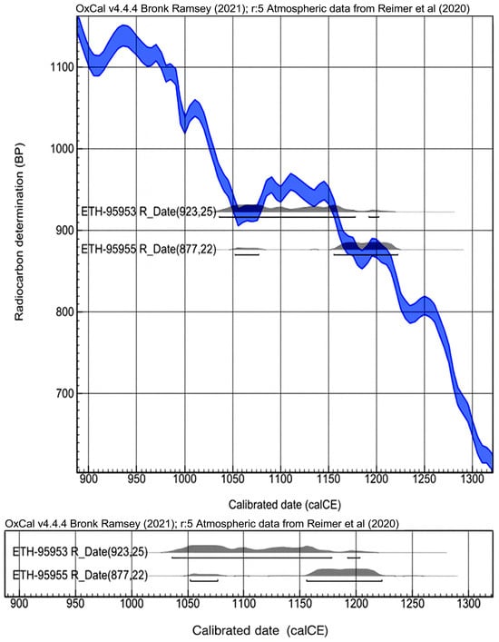 The first radiocarbon ages obtained on material from the 20th century excavations confirmed that the textiles were produced in 11th–12th centuries CE, as based on the textile analysis (see Table 4) []. The radiocarbon dates are plotted on the calibration curve presented in Figure 8.