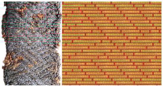 The analysed bands have a complex, multi-layered structure resulting from the use of weft-faced compound weave, with one warp, main weft and supplementary patterning weft of metal wrapped thread. The first layer consists of a fibrous warp and the main weft in a twill weave. The second layer consists of metal threads bound with warp in a regular twill weave or in various variants of a broken twill weave, creating geometric patterns in the form of interwoven ribbons, rhombuses, and other motifs (Figure 2) [,].
