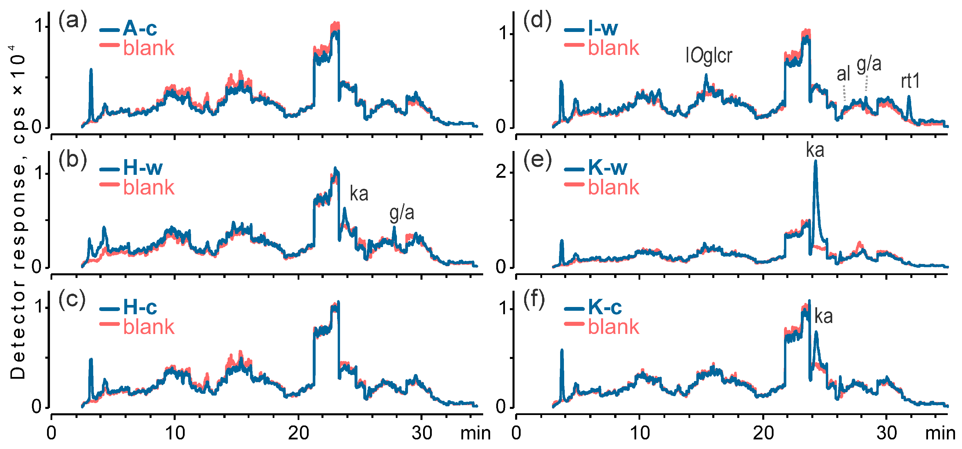 - Abu-Reidah, I.M.; Contreras, M.M.; Arráez-Román, D.; Segura-Carretero, A.; Fernández-Gutiérrez, A. Reversed-phase ultra-high-performance liquid chromatography coupled to electrospray ionization-quadrupole-time-of-flight mass spectrometry as a powerful tool for metabolic profiling of vegetables: Lactuca sativa as an example of its application. J. Chromatogr. A 2013, 1313, 212–227. [Google Scholar] [CrossRef] [PubMed]