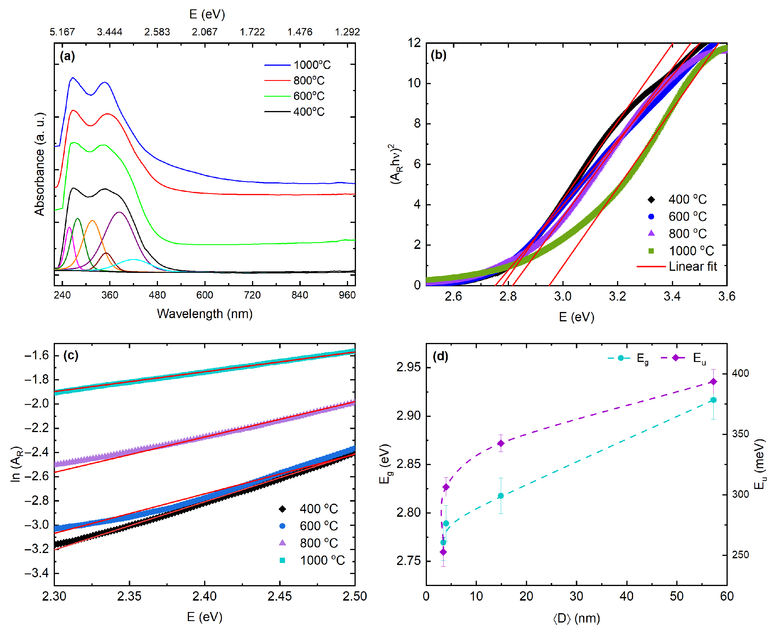 | Calcination Temp. (°C) | Optical Band Gap (eV) | n | (meV) | ||