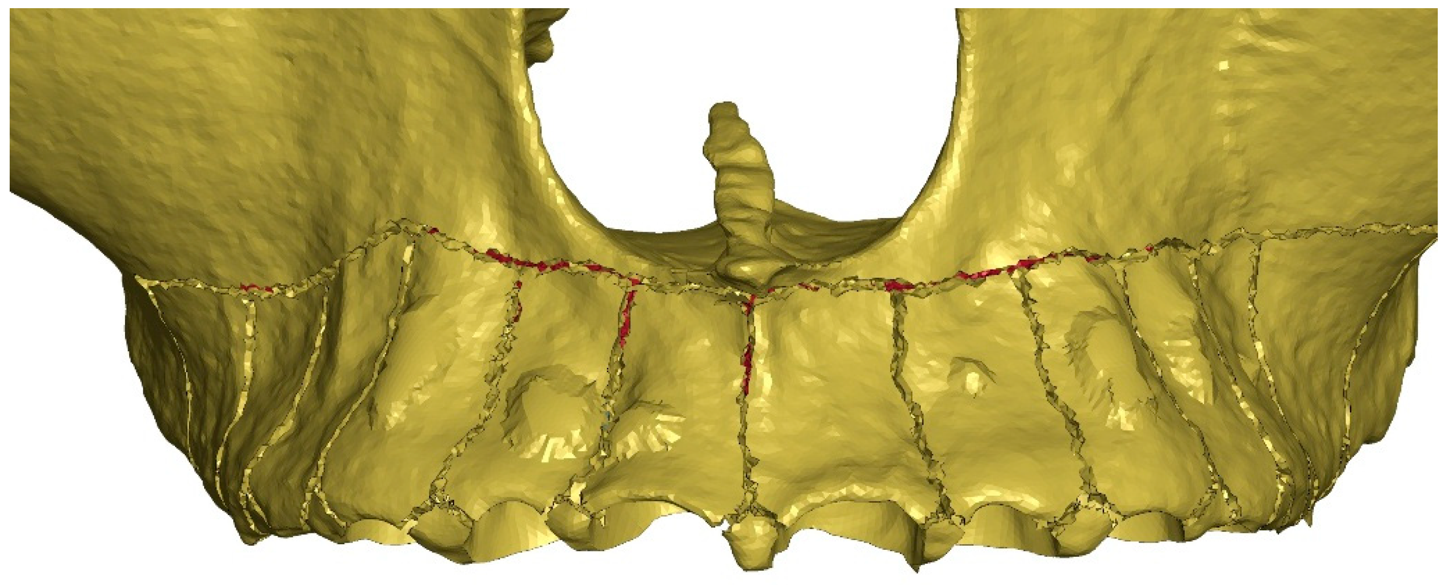 - Yang, C.; Wang, C.; Deng, F.; Fan, Y. Biomechanical effects of corticotomy approaches on dentoalveolar structures during canine retraction: A 3-dimensional finite element analysis. Am. J. Orthod. Dentofac. Orthop. 2015, 148, 457–465. [Google Scholar] [CrossRef] [PubMed]