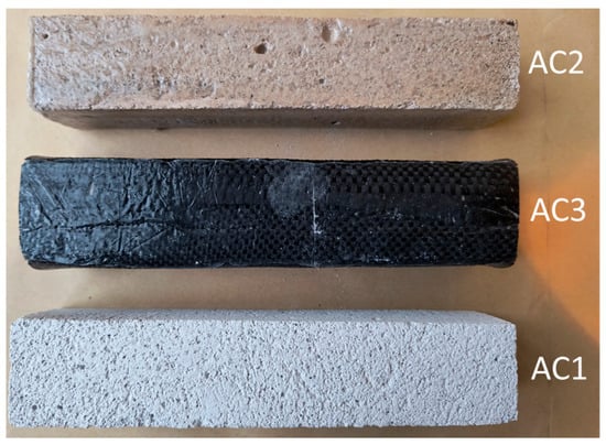 In the case of sample AC3, the impregnated carbon fibre mat was pressed with a boatbuilding roller until the resin gelled. In the case of sample AC6, the resin-impregnated fabric was pressed with a boatbuilding roller, then wrapped in release film and pressed with non-stretch tape. This method of sample preparation significantly improved the strength parameters. A carbon mat with a plain weave (1/1) is characterised by high stability, stiffness and resistance to slippage, which makes it ideal for simple elements and reduces resin consumption. Its disadvantage is lower flexibility and less susceptibility to forming compared to a twill weave, especially in the case of complex shapes. The aerated concrete and carbon mat were purchased online. Aerated concrete—MIAMI Tomasz Zawadzki Sp. z o.o., Kasztanowa 6, 76-200 Słupsk, carbon mat—https://www.tkane-composites.pl/ (accessed on 10 November 2025). The volcanic rock was purchased in Turkey in the city of Sanliurfa—Fe Topuk Taşi pumice stone 8693203014190.