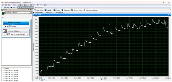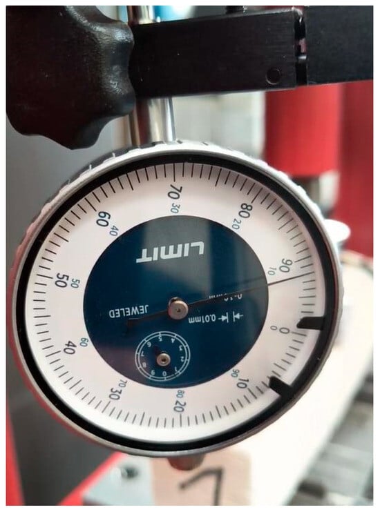 To estimate the maximum destructive force, a preliminary experiment was carried out on a hydraulic press with a cylinder pressure of 12 tons (Figure 3). During the tests, the maximum force and deflection of the beam were recorded using a dial gauge (Figure 4). The distance between the beam supports was set at 100 mm. The signals were recorded using a Wobit KMM20 force sensor (WObit, Pniewy, Poland) linearity tolerance 0.25%, an eDAQ-9178 chassis (National Instruments, Austin, TX, USA) for measurement systems with a multi-channel module equipped with NI 9234, and LabView Signal Express 2015 software on a laptop computer (Figure 5).