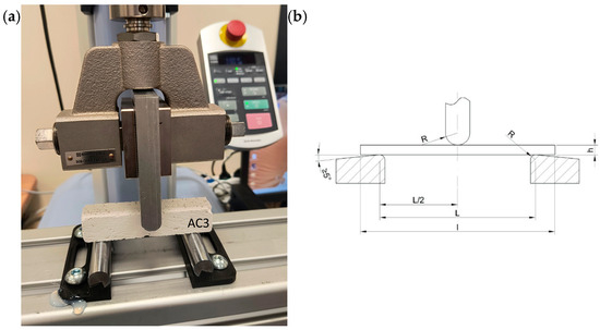 The data analysis was performed per the guidelines in ISO 178:2019 [75] and EN 196-1:2016 [76]. Both standards concern triaxial bending tests (Figure 6b) of composite and concrete materials. Based on the tests and the results obtained, the flexural strength and flexural strain were determined using the following formulas: