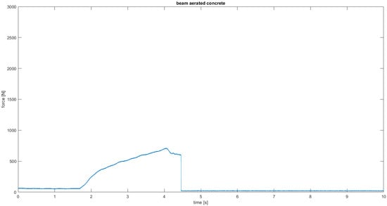 Figure 12 shows increased flexural strength for samples reinforced with a resin layer of aerated concrete and volcanic rock. The only difference is the duration of bending. The base sample of unreinforced volcanic rock was locally crushed, and the bending process was delayed. In contrast, the bending of the other samples proceeded according to the procedure. The starting point for all characteristics was the tensometric force sensor (strain gauge) reading from a value of 0.1 N.