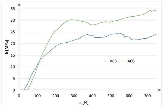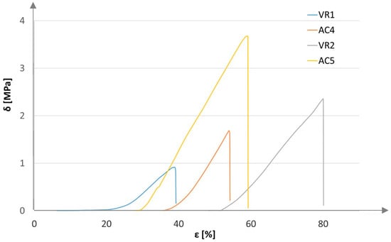 For the recorded measurement values, bending strength characteristics were plotted: stress as a function of strain (Figure 12 and Figure 13).