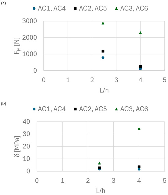 (a) Dependence of force on the L/h ratio, (b) dependence of bending stress as a function of the L/h ratio.