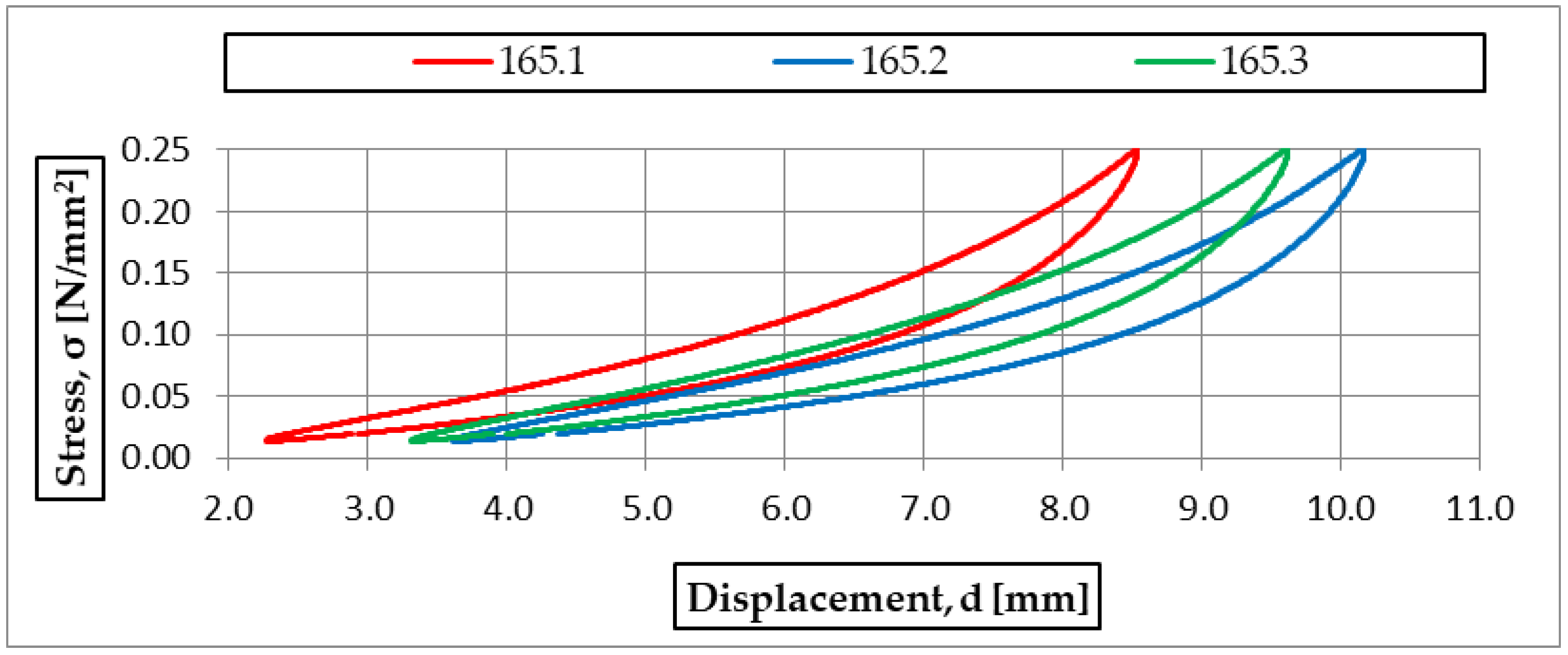 As shown, the frequency ranges used to determine the dynamic bedding moduli partially overlap. Nevertheless, due to differences in testing procedures, the obtained values of the and moduli may vary, even when measured at the same loading frequency. In view of this variability, and as outlined earlier, the present study concentrates on the static mechanical behavior of under-ballast mats under controlled laboratory conditions, with particular emphasis on the determination of static stiffness moduli. The static stiffness modulus is defined as the ratio of the difference in stress to the corresponding difference in deflection within a specified range of applied loads.