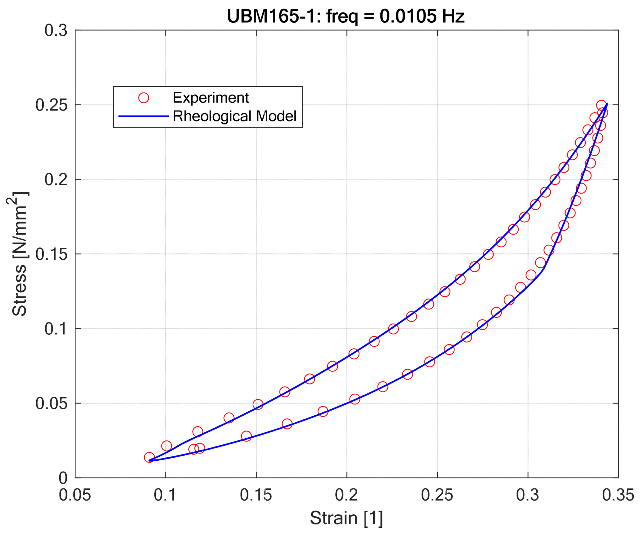 The present model was formulated for UBM materials that exhibit rate-independent hysteresis and reversible deformation. For other materials of similar pseudoelastic character, the same mathematical formulation could be used after parameter recalibration. For materials with pronounced viscosity or plasticity, additional rheological elements would be necessary to capture their specific behavior.