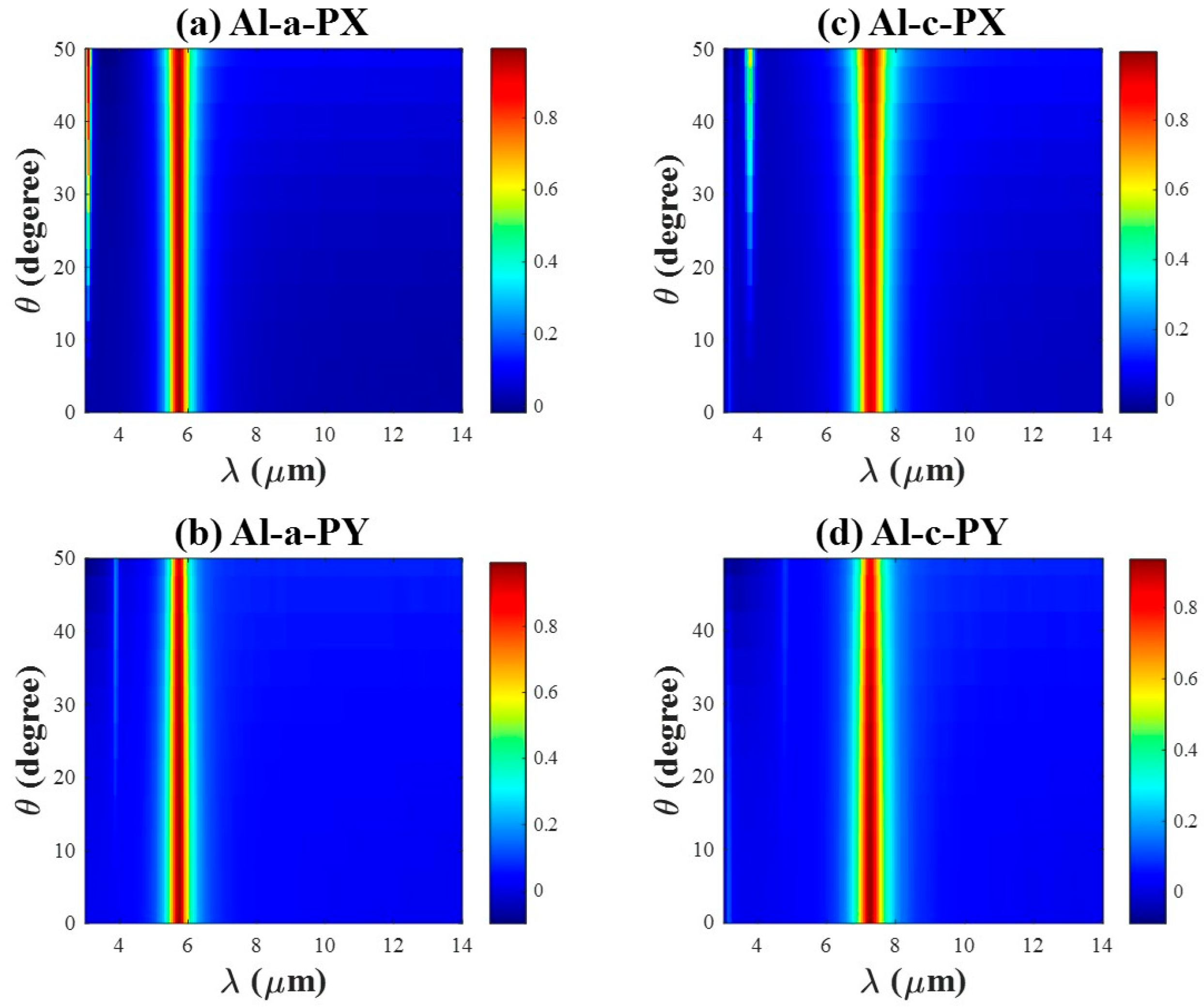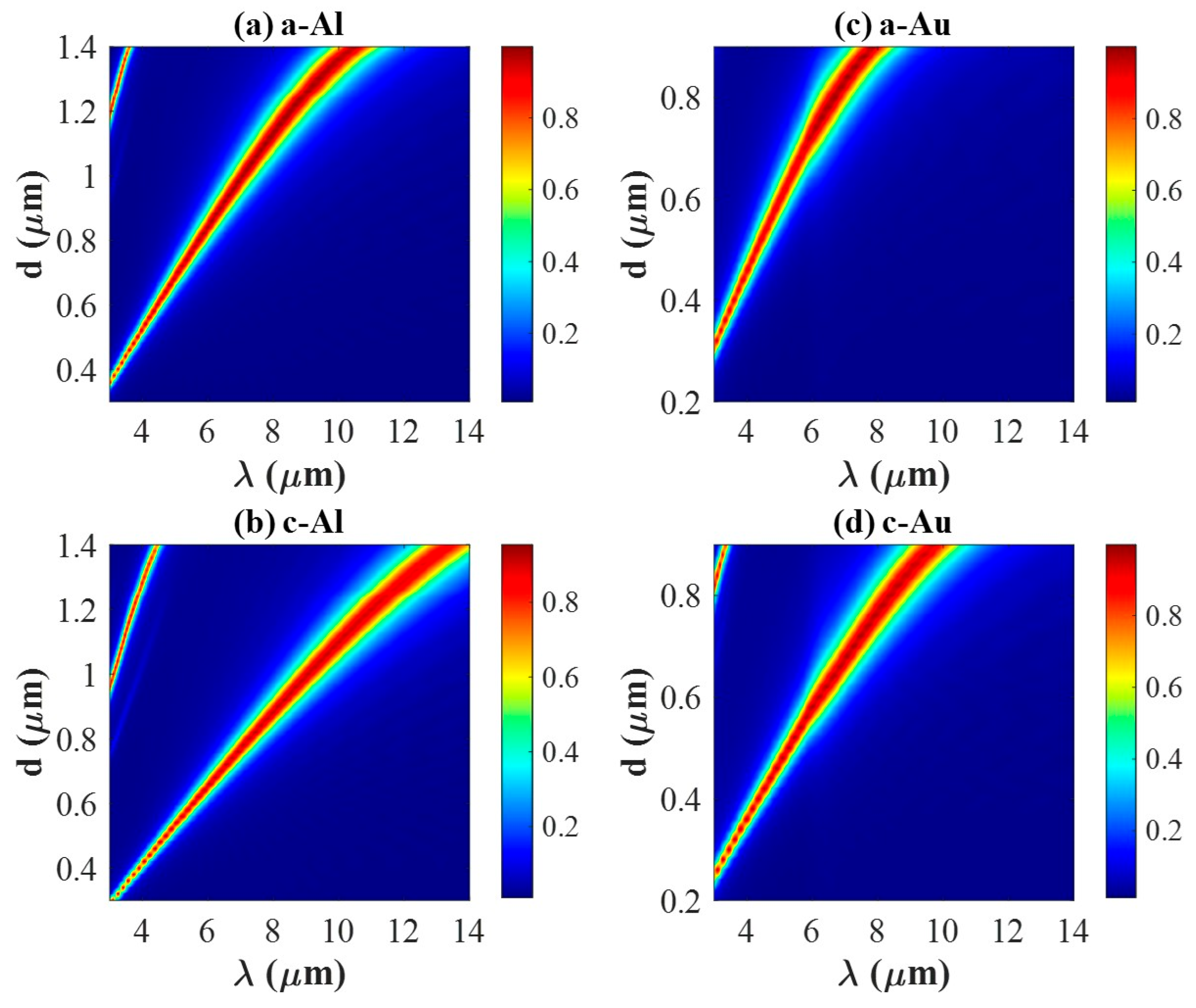 - Chen, Z.; Weng, Y.; Liu, J.; Guo, N.; Yu, Y.; Xiao, L. Dual-band perfect absorber for a mid-infrared photodetector based on a dielectric metal metasurface. Photonics Res. 2021, 9, 27–33. [Google Scholar] [CrossRef]