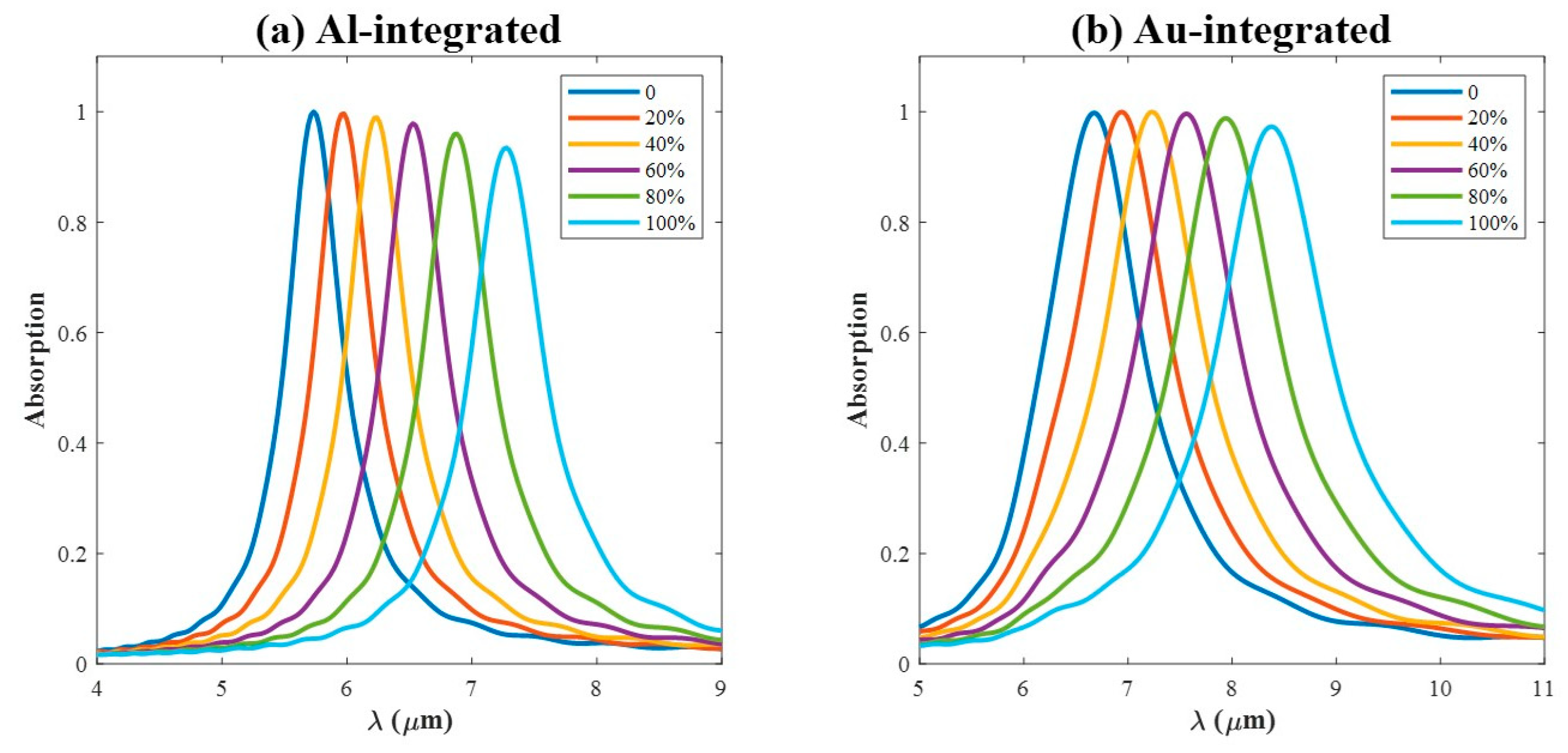 - Zou, M.; Li, Y.; Zhao, W.; Zhang, X.; Wu, Y.; Peng, C.; Fan, L.; Li, J.; Yan, J.; Zhuang, J.; et al. Dynamically tunable perfect absorber based on VO2-Au hybrid nanodisc array. Opt. Eng. 2021, 60, 87103. [Google Scholar] [CrossRef]