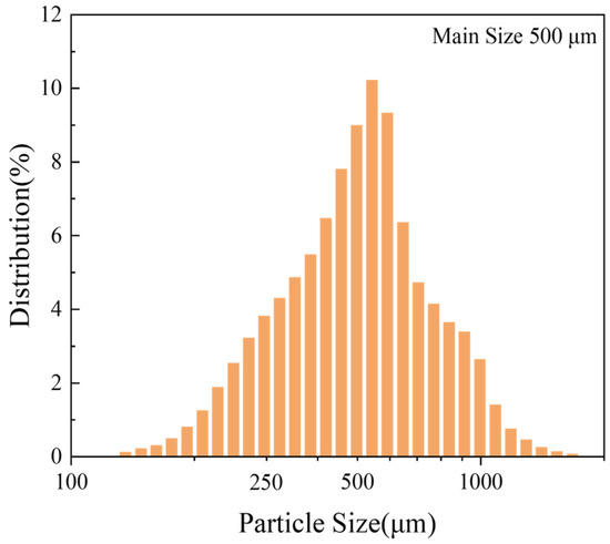 The particle size distribution of the pure Mg powder used in this study is shown in Figure 1. Finer powders have a higher surface area, and research has shown that finer powders have a lower ignition point [15], which can easily pose safety issues during their production. Therefore, for a comprehensive consideration of safety and cost, pure magnesium particles (main size of approximately 500 μm) were used as the sample in this experiment.