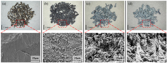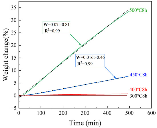 Figure 4 shows the TG results of untreated samples for 8 h isotherms at different temperatures. The TG results of the samples heated at 300 °C exhibited almost no change, and the surface still possessed a metallic luster and dense oxide layer, as shown by the microscope and SEM images presented in Figure 5a. The weight change (Figure 4) of the samples heated at 400 °C for 8 h was also almost negligible; however, the surface became black, and a large number of white magnesium oxide particles were produced on the Mg surface, as shown in the SEM images. Nevertheless, the oxide film retained some strength and did not break, as shown in Figure 5b. Figure 4 shows that as the temperature continued to increase, the mass growth at 450 and 500 °C was a straight line according to oxidation kinetics. The magnesium oxide film was not protective and could not prevent the combination of Mg ions and oxygen. As shown in Figure 5c,d, the surface became a white, unprotected, thick film of magnesium oxide. The SEM results showed that this layer was loose and porous, proving that the PBR of MgO was 0.81. The surface contained many cauliflower-like structures, indicating significant evaporation of Mg.