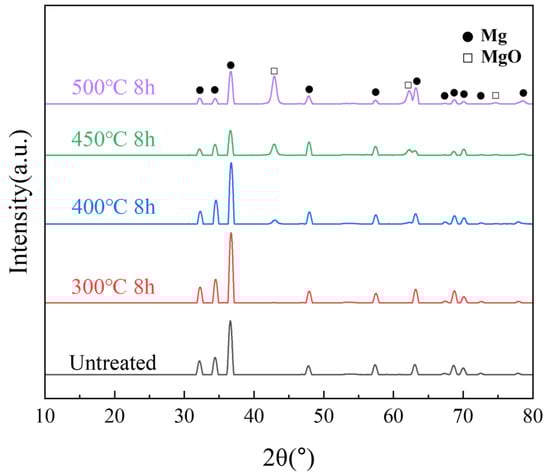 XRD is commonly used to investigate the crystalline structure information of powders. The XRD results of the samples heated below 400 °C showed only the Mg peak, as shown in Figure 6. As the temperature increased, the internal grain size increased, and the intensity of the Mg peaks decreased. A new peak originating from MgO was detected near 44° at temperatures above 400 °C. The higher the temperature, the higher was the intensity of the MgO peak. The growth of MgO was significantly larger at 450 and 500 °C. A certain amount of MgO began to form inside the powder, indicating that high-temperature oxidation reactions occurred not only on the surface but also more severely within the interior of the particles.