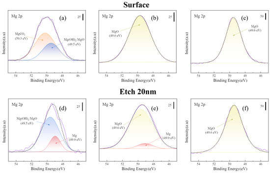 Peak separation of Mg 2p in Figure 7. [(a) untreated; (b) 300 °C-8 h; (c) 500 °C-8 h; (d) etching 20 nm of (a), (e) etching 20 nm of (b), and (f) etching 20 nm of (c)].