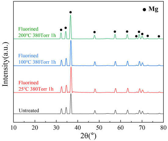 Figure 9 shows the internal XRD patterns of the untreated and fluorinated samples. Even after fluorination at 200 °C, no peak corresponding to MgF2 was observed in the XRD pattern. This implies that fluorination occurred on the surface layer and did not affect the internal crystal structure of the material. In the SEM and EDS analyses, compared with the untreated powder, the fluorinated powder exhibited a uniformly distributed fluorine signal on the surface, while the intensity of the oxygen signal decreased, indicating that the surface MgO was transformed into MgF2 (Figure 10).