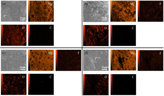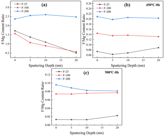 The ratio of fluorine to magnesium effectively reflects the fluorine content on the sample surface. Figure 15a shows the ratios of fluorine and magnesium contents at different depths for the three groups of samples after fluoridation. The MgF2 content at different depths increased with the temperature. Figure 15b,c show the analysis of the elemental content on the surface of the samples after high-temperature heat treatment, and the results are consistent with Figure 15a, in which the MgF2 content increases with an increase in the temperature of the fluoridation treatment of the samples. Combined with the weight change shown in Figure 13, MgF2 improved the high-temperature antioxidant performance of pure Mg.