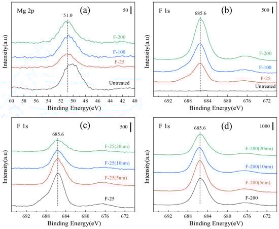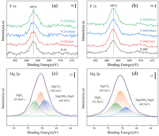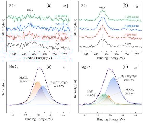 XPS spectra (a) various samples of Mg 2p and (b) F 1s; (c) depth spectra of F-25 samples and (d) F-200 samples.