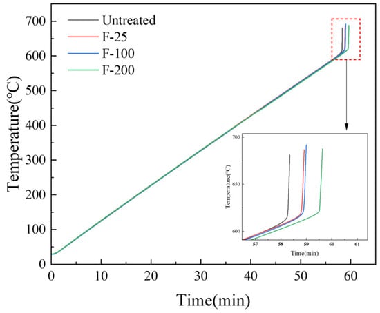 Ignition point tests were performed on untreated and fluorinated samples at conditions—20–700 °C and a heating rate of 30 °C/min. The ignition point of pure magnesium is approximately 630 °C [40]. However, the ignition point of the pure Mg powder measured in this experiment was approximately 614.4 °C, as shown in Figure 12, which is due to the high surface area of the powder, making it more prone to oxidation reactions. The powder sample was more likely to burn because of its small size [15]. Figure 12 shows that the ignition points of the samples after the three fluorination treatments all increased, and the ignition point of F-200 increased by approximately 10 °C compared with that of the untreated sample.