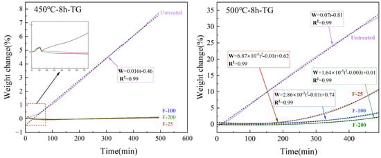 Compared to the untreated samples, the fluorinated samples heated at 450 °C for 8 h in air presented almost no mass change, as indicated in Figure 13. The SEM images (Figure 14b,c) of the surfaces of the fluorinated samples after heating at 450 °C for 8 h in air are similar to those of the fluorinated sample surfaces before heating (Figure 10). White oxide films or cracks were not observed, as observed on the surface of the untreated sample (Figure 14a). This indicates that MgF2 can help protect the surface of Mg from oxidation at temperatures below 450 °C. However, upon increasing the temperature to 500 °C in air, the mass change with time curve of the fluorinated samples can be fitted as a quadratic equation based on the oxidation kinetics. This indicates that MgF2 on the surface has a protective effect against the continuous accumulation of Mg vapor. As the reaction time increased beyond 200 min, MgF2 on the surface continued to break down, and the oxidation rate changed from slow to fast, resulting in the continued growth of the oxide film. Consequently, the oxidation weight gain curve of the F-25 samples after 8 h was almost similar to that of the untreated sample, as shown in Figure 13. In the case of the F-25 samples (Figure 14d) subjected to heating at 500 °C for 8 h, the microscope image shows that a white oxide film was generated on the surface of the Al substrate. The oxide film was sparse and porous in the SEM images, and its surface morphology was similar to that of the untreated samples, as shown in Figure 5c,d. This indicates that the MgF2 layer on the F-25 samples was insufficient to protect against oxidation at temperatures beyond 500 °C in air; the weight change (%) of the F-100 and F-200 samples after 8 h was limited to 3.14 and 2.12, respectively. As shown in Figure 14e,f, although the surface started to become dull, it still appeared as a dense protective layer in the SEM images.