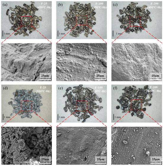 Microscope and SEM images of fluorinated samples after isothermal heating at 450 °C for 8 h [(a) F-25, (b) F-100, (c) F-200] and 500 °C for 8 h [(d) F-25, (e) F-100, (f) F-200].