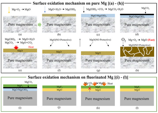 Surface oxidation mechanism of (a–h) untreated and (i–l) fluorinated magnesium samples according to different heating temperature. [(a–d): <350 °C, (e,f): 350–400 °C, (g,h): >450 °C, (i): <350 °C, (j–l): 350–500 °C].